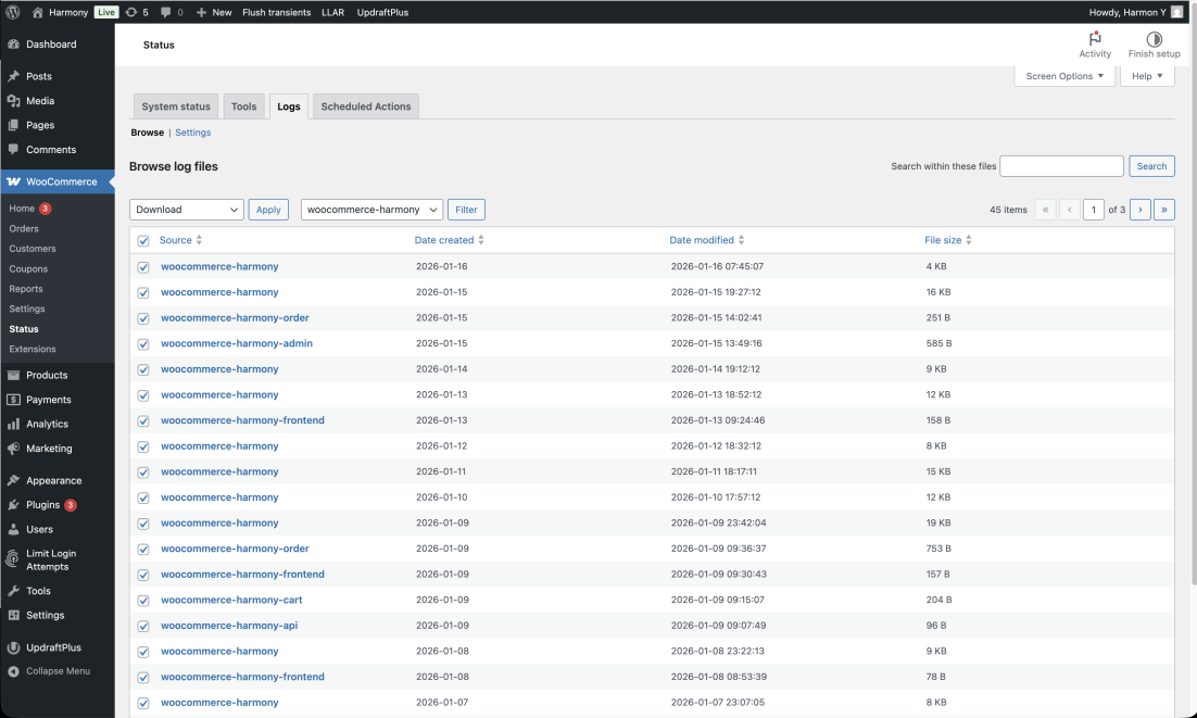 - WooCommerce → Settings → Harmony → Status.